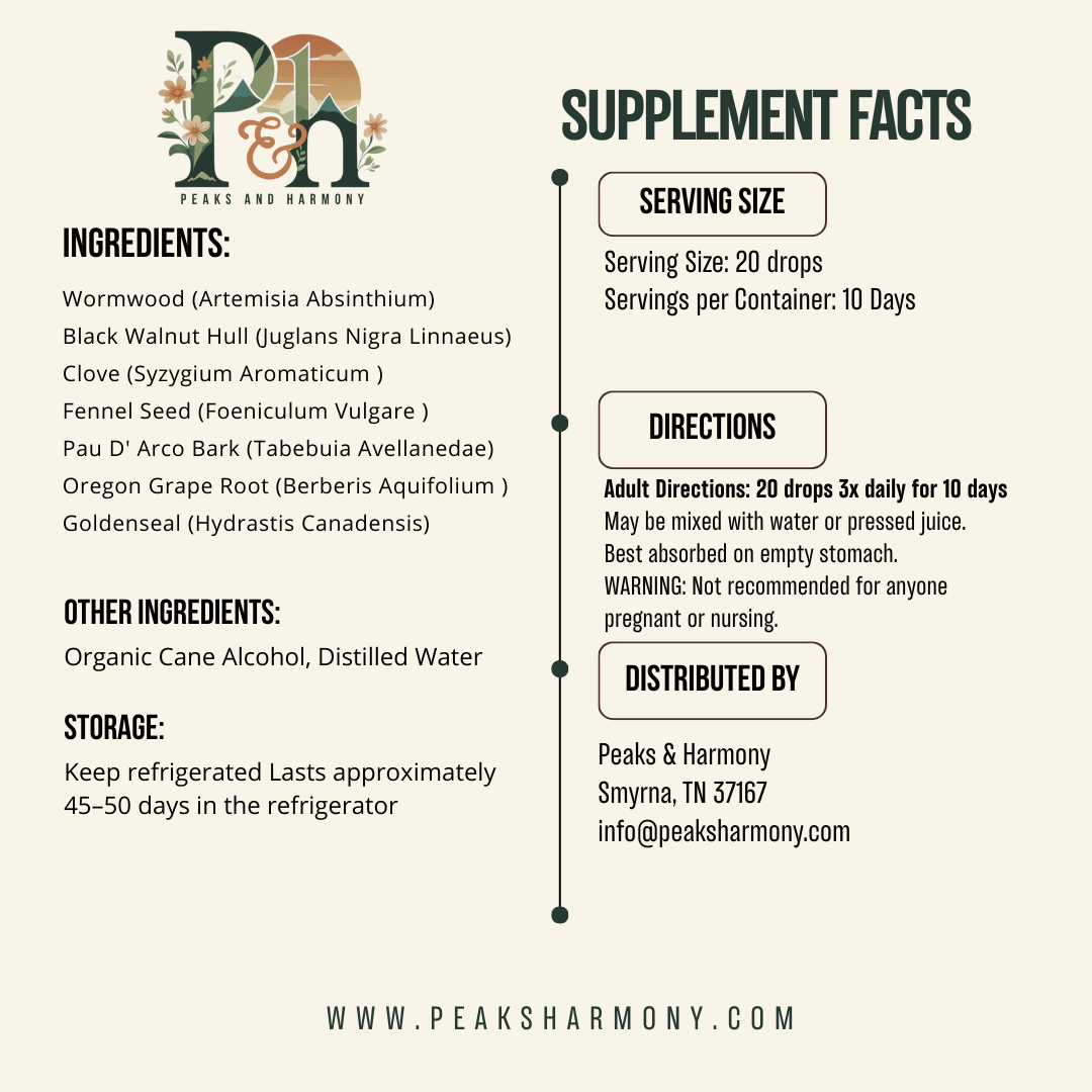Parasite Cleanse: Targets and eliminates various types of parasites, ensuring a thorough detoxification process. Enhances gut health by promoting a balanced micro-biome and improving nutrient absorption. 2 FL oz 30 servings