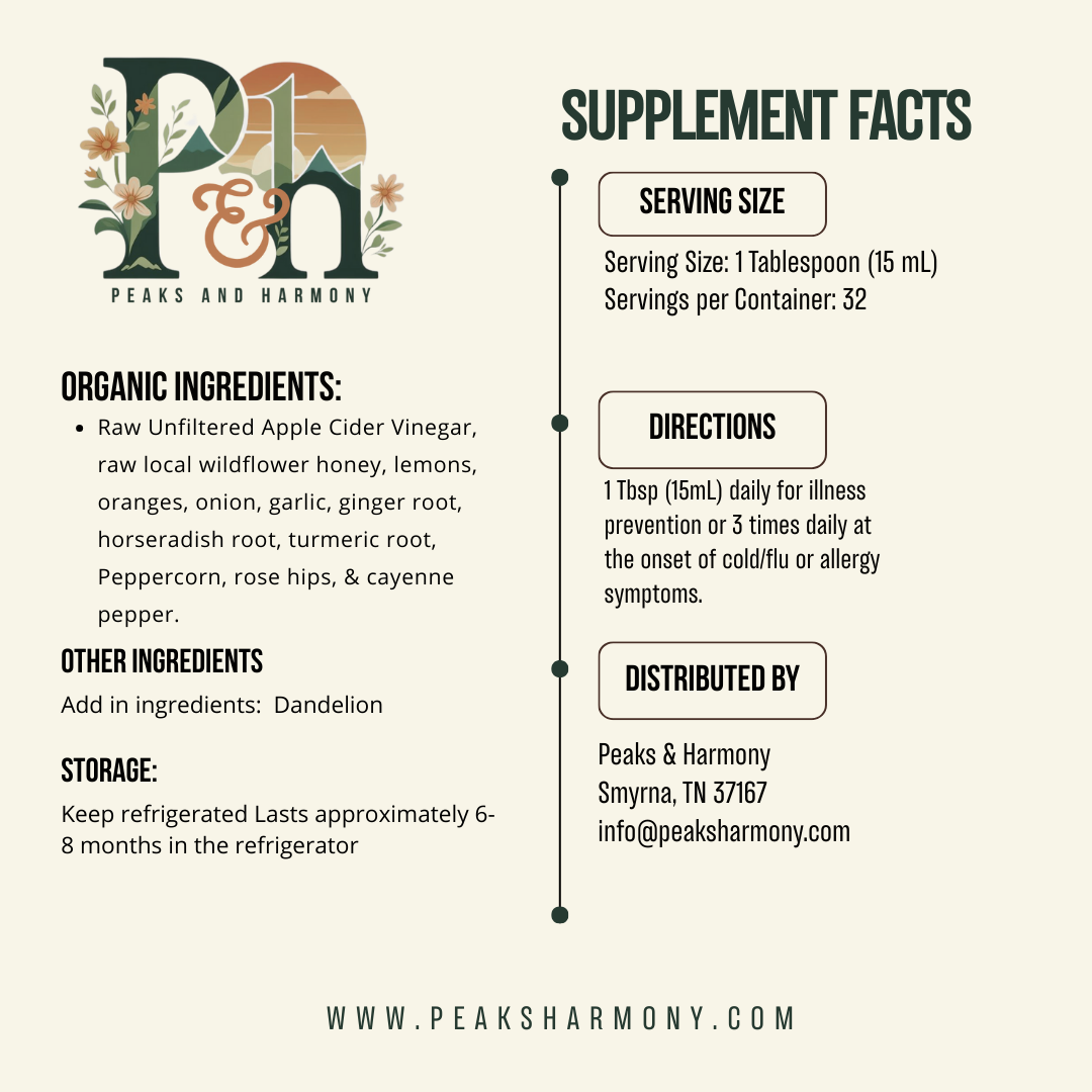 Peaks & Harmony Fire Cider is made with all raw and natural ingredients.