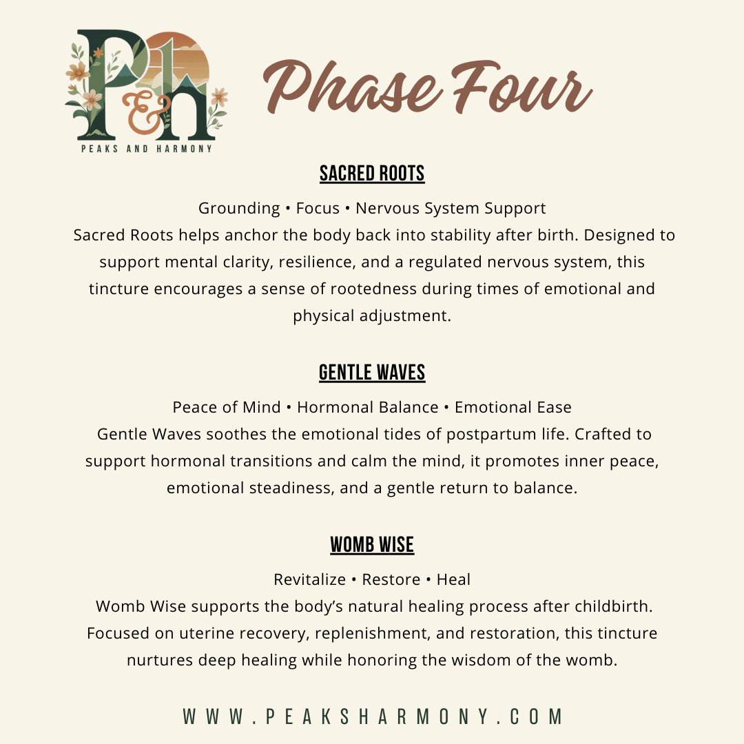 Phase Four is intended to complement; not replace medical postpartum care. These tinctures are crafted to support natural healing, nourishment, and balance during a deeply transformative time.