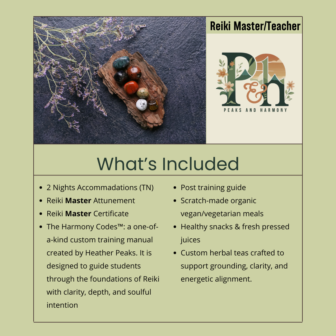 The Harmony Codes: A sacred curriculum that weaves together the time-honored teachings of Mikao Usui’s Reiki principles with modern, soul-led practices designed for today’s healers, offering clarity, depth, and practical wisdom.