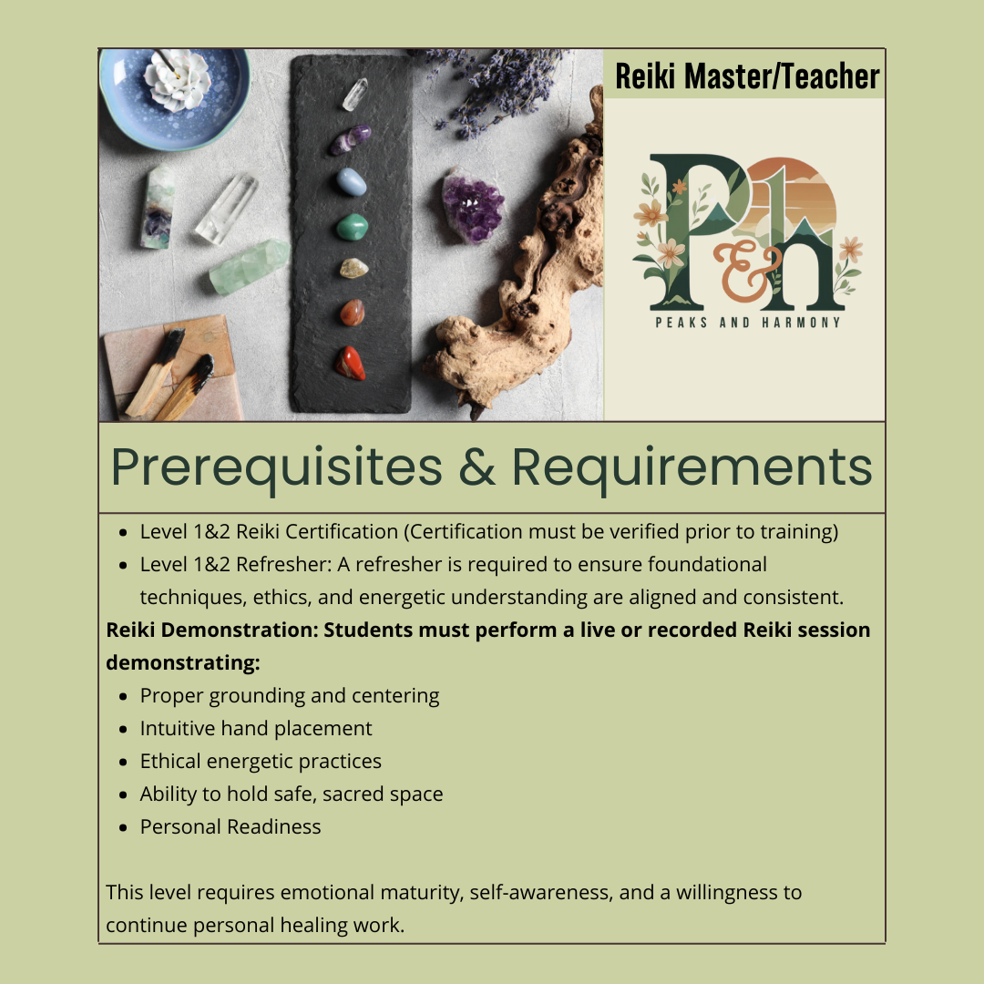 Learn how to hold sacred space, transmit Reiki attunements, teach Reiki ethically and confidently, and live in alignment with Reiki principles. This level is for practitioners who are ready to step into mentorship, lineage, and service.
