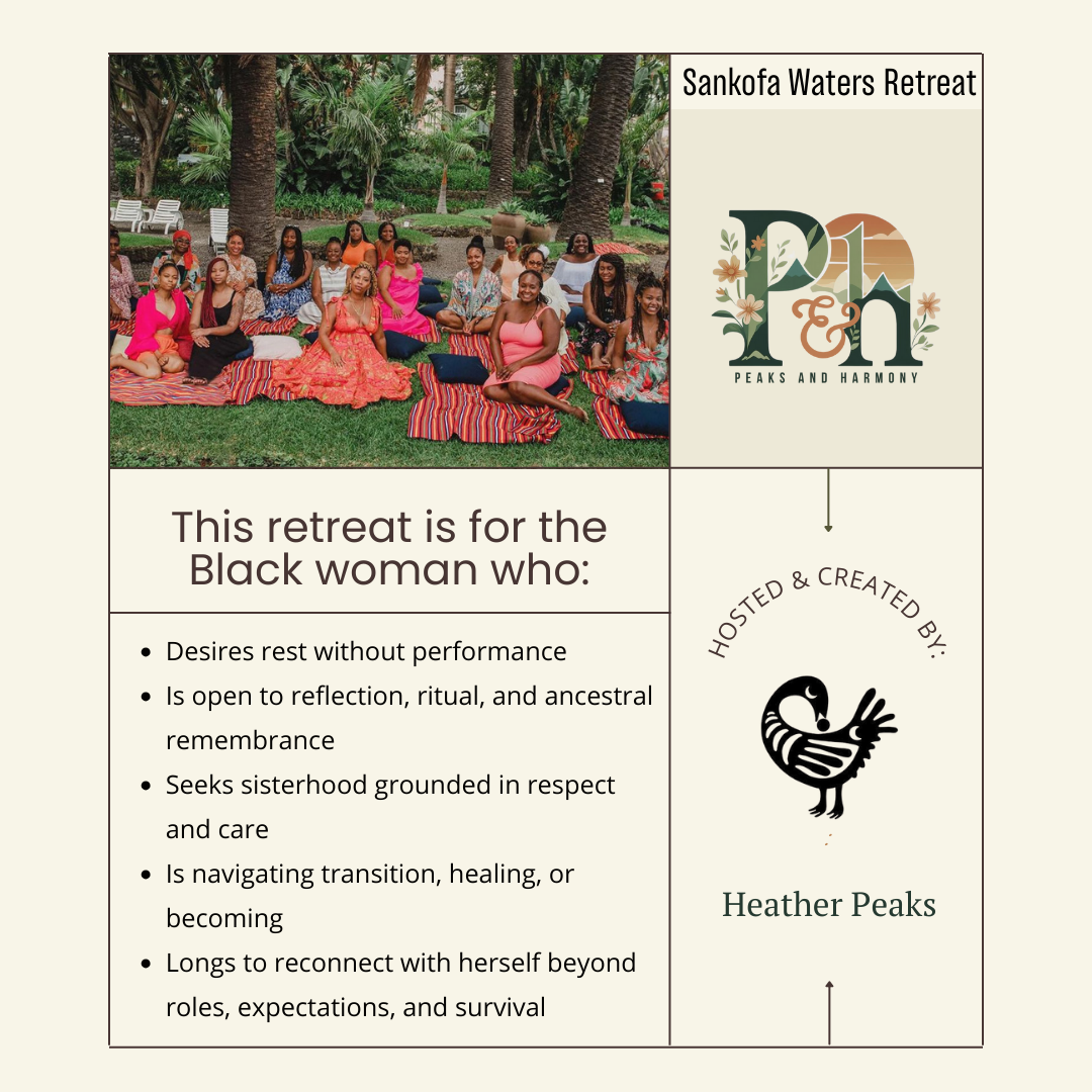 The Sankofa Waters Retreat is a sacred wellness retreat created exclusively for Black women, rooted in ancestral remembrance, restoration, and return.