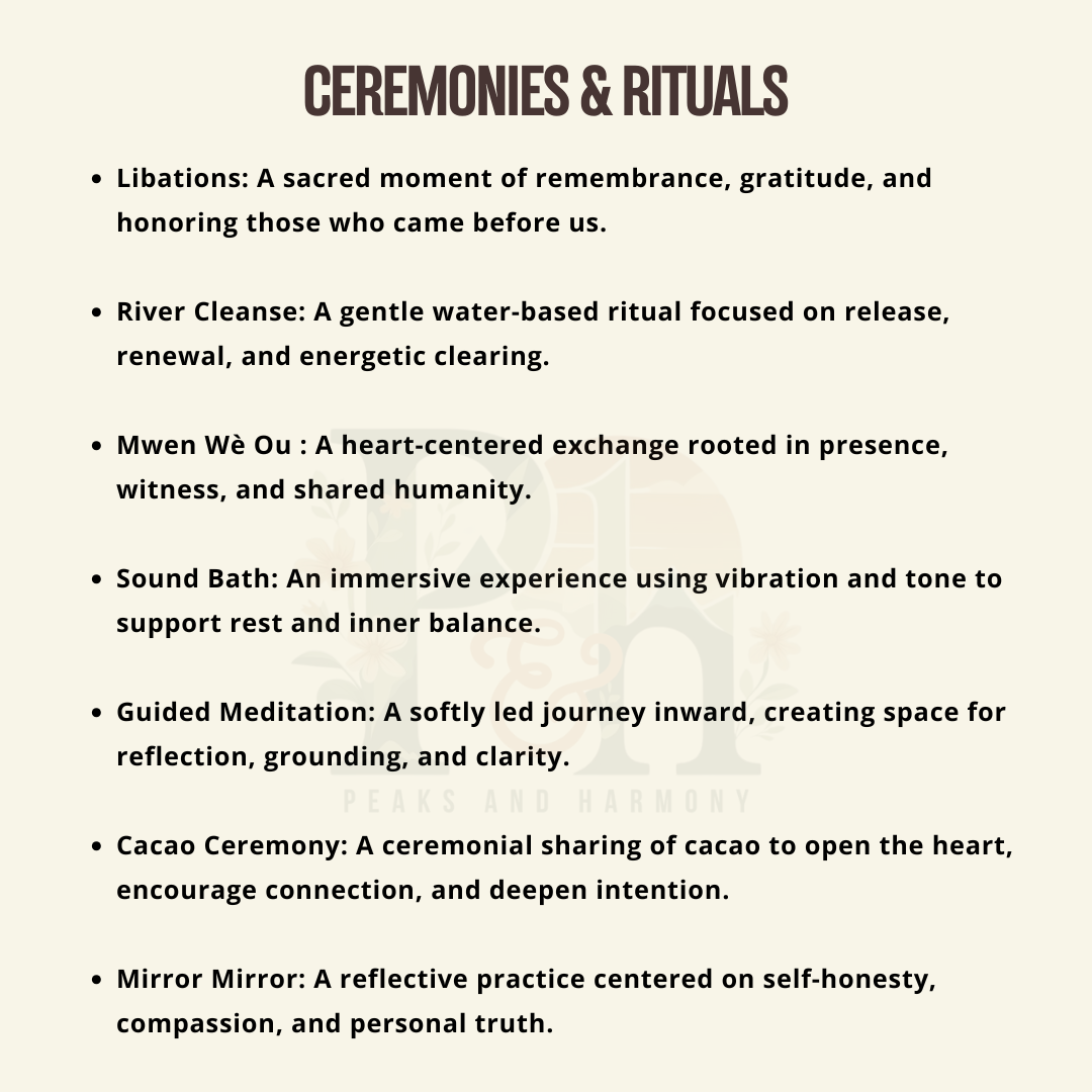 Because the rituals and ceremonies are deeply tied to shared ancestral traditions and lived experience, this retreat is intentionally reserved for Black women only, creating a protected space for authentic healing, connection, and collective renewal.