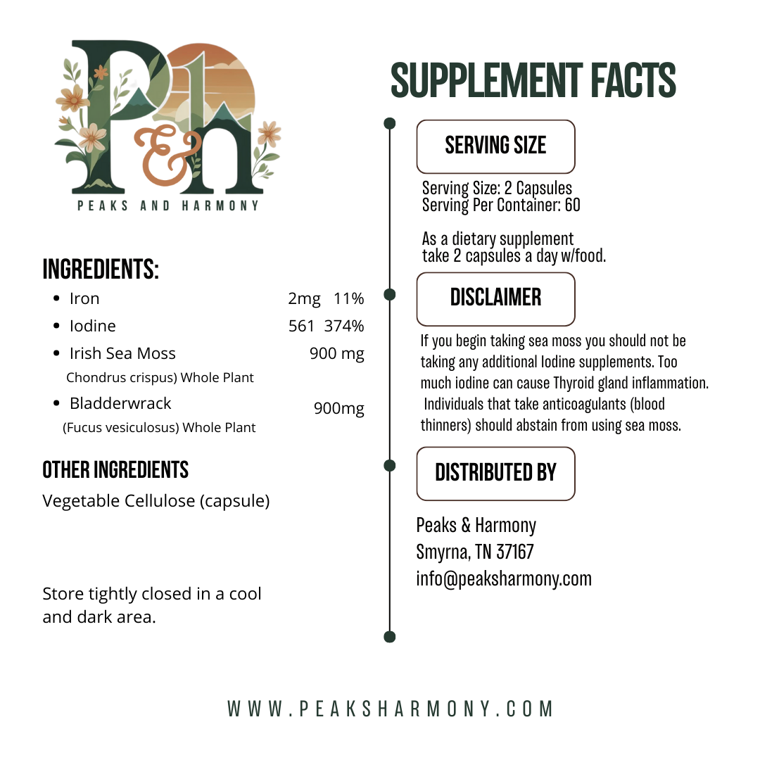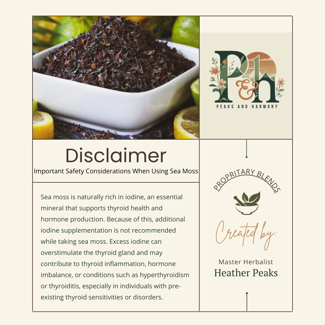 Sea moss is naturally rich in iodine, an essential mineral that supports thyroid health and hormone production. Because of this, additional iodine supplementation is not recommended while taking sea moss. Excess iodine can overstimulate the thyroid gland and may contribute to thyroid inflammation, hormone imbalance, or conditions such as hyperthyroidism or thyroiditis, especially in individuals with pre-existing thyroid sensitivities or disorders.